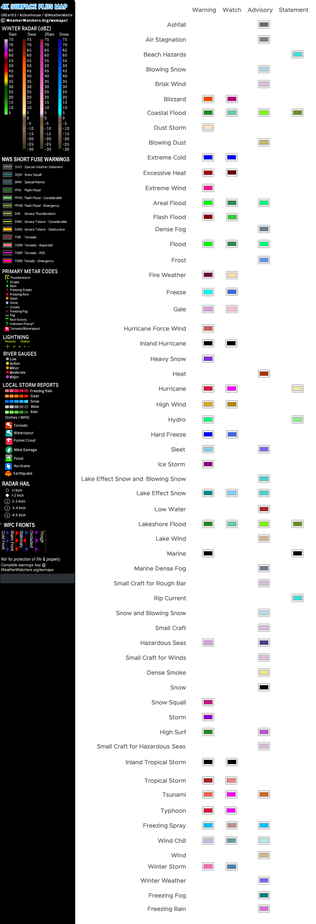 WeatherMatrix 4K Weather Map (Surface PLUS!) Radar + Fronts, Rivers, METARs, Warnings, EQs, LSRs KEY |